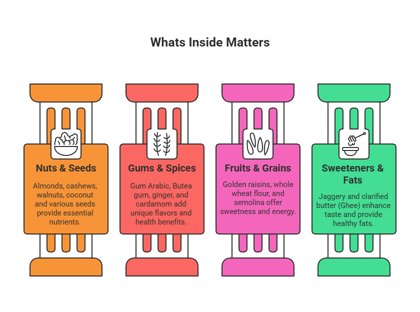 Almond, cashew, walnut, popped water lily seed, melon seed, sesame seed, poppy seed, nigella seed, fennel seed, gum Arabic ("gond"), Butea gum, ginger, cardamom, coconut, golden raisins, whole wheat flour, semolina, jaggery, ghee